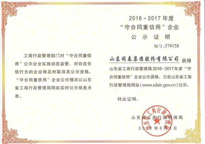 20188月,公司獲得山東省工商行政管理局20162017年度“守合同重信用”企業(yè)公示資格。